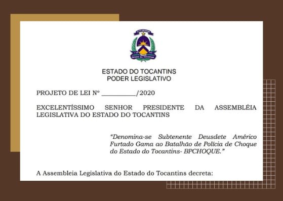 O projeto de autoria do presidente da casa, da o nome do Subtenente Deusdete Américo Furtado Gama ao Batalhão de Polícia de Choque do Estado do Tocantins- BPCHOQUE. Na justificativa do projeto o deputado destaca que o Sargento Gama, era um colega muito querido e uma grande referência de disciplina, sempre pronto para servir, prestou diversos serviços para o nosso Estado ao longo da sua carreira e que diante de toda a contribuição dada pelo servidor, justa se faz a referida homenagem.